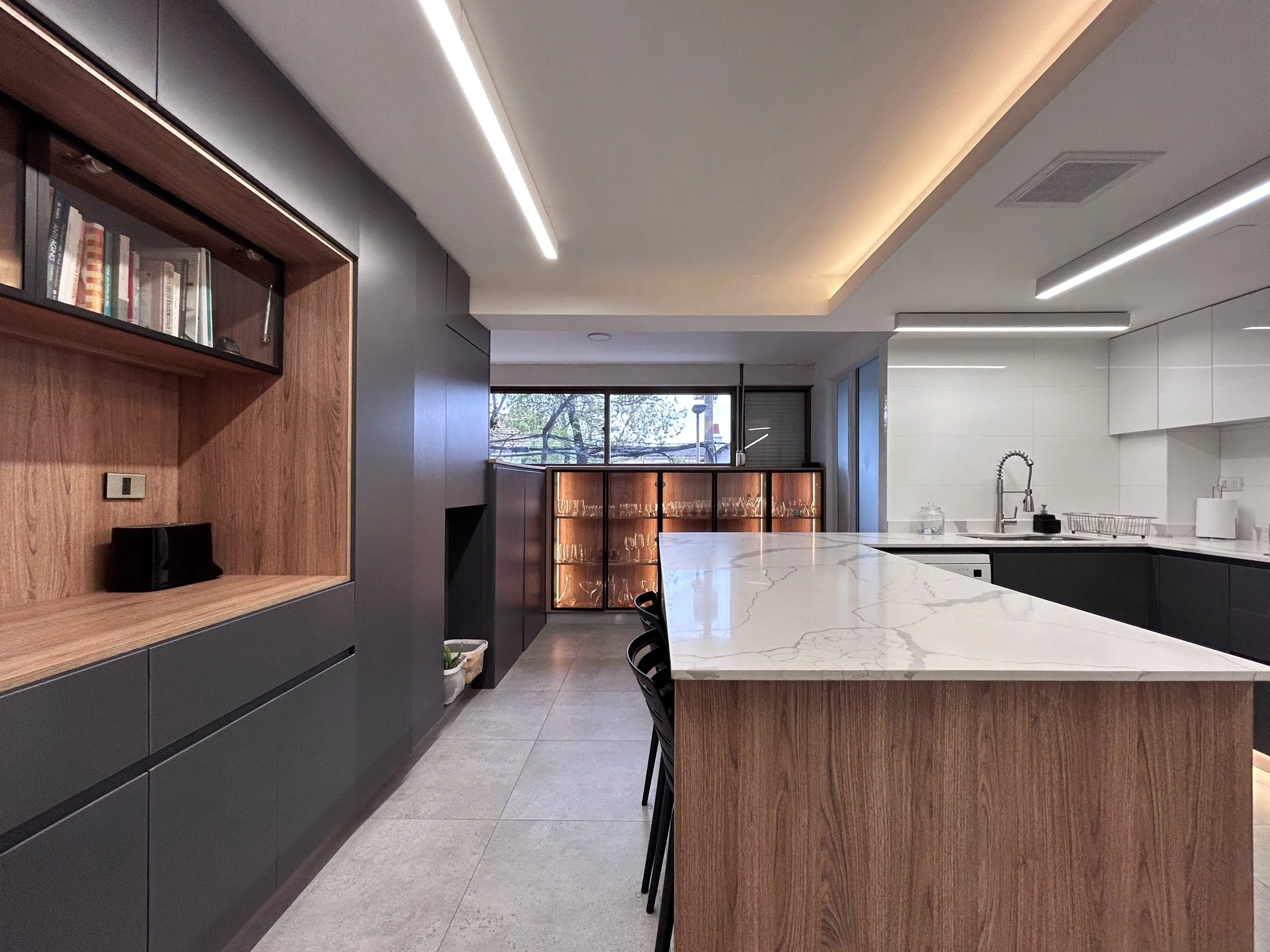 La remodelación consistió en la integración de la cocina existente con la logia y pieza de servicio para lograr un gran espacio que permitiera generar esta nueva cocina, con un gran mesón central, muebles perimetrales y sector de vitrina.